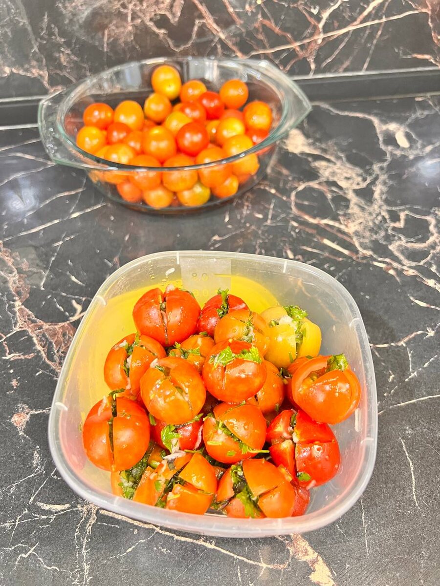 Затем помидоры помещаются в выбранную емкость и отправляются в холодильник на не менее чем час. Это позволит закуске пропитаться всеми вкусами и ароматами и будет идеальным завершением летнего дня.