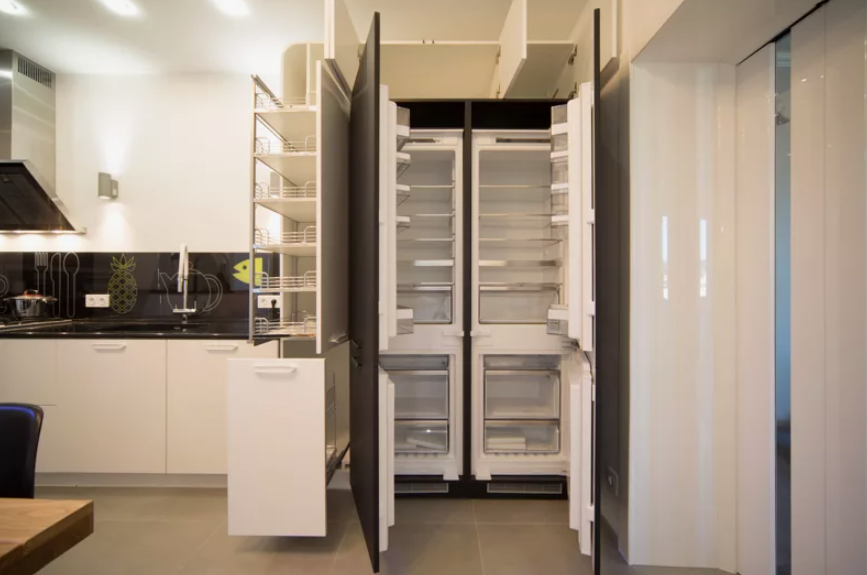 Встраиваемые холодильники, в свою очередь, являются частью кухонного гарнитура и не обладают ярко выраженным корпусом. Они устанавливаются в специально подготовленное пространство, в результате чего их фасад скрывается за мебельным покрытием. Это создает гармоничный стиль, привнося в пространство изысканность. Существуют как варианты полной, так и частичной встройки, когда некоторые элементы остаются на виду.