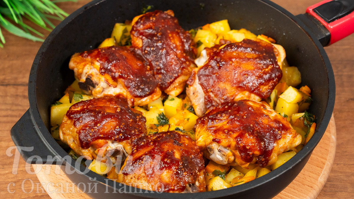 Приготовление: Куриные бедрышки очистить, замариновать с солью, перцем и паприкой. Обжарить до золотистой корочки, затем добавить овощи и тушить. Параллельно приготовить соус и добавить его к курице. Запекать в духовке около 25 минут.