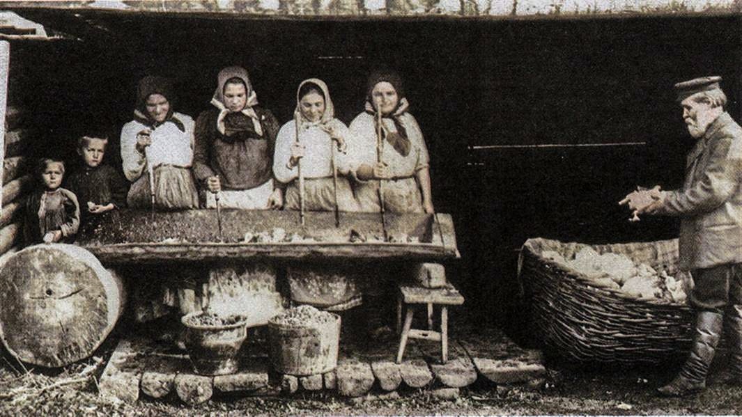 На фотографии можно увидеть процесс подготовки капусты, который объединяет поколения. Два мальчика, с любопытством разглядывающие старших, в одежде, типичной для крестьян, явно ощущают атмосферу силы и общих усилий. Их мать, находясь рядом, оберегает их, словно защищая от детских шалостей. В то время как три женщины в платках оценивают работу с серьёзностью, присущей лишь истинным хозяйкам.