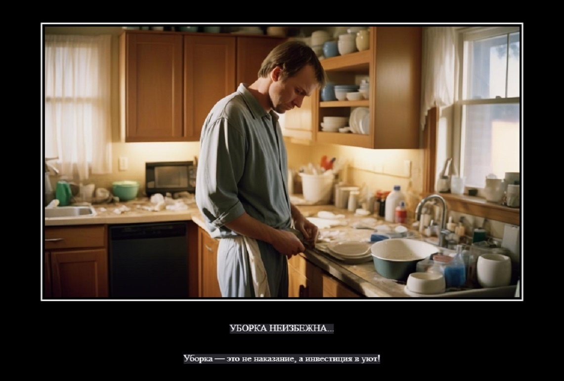 В конце концов, можно обнаружить, что, несмотря на все усилия, горка не уменьшается. Возникает вопрос: "Почему же не помыли хотя бы одну тарелку самим?" Долгое общение с женой приводит к осознанию, что ее труд, включая готовку и уборку, также требует признания и понимания.