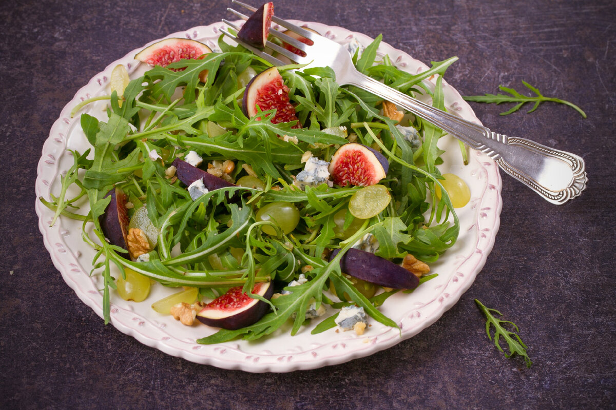 Этот салат — это не только вкусно, но и ярко. Сладкие фиги обеспечивают сочность и сладость, тогда как голубой сыр или фета добавляют необходимую солоноватость и пикантность. Хрустящие грецкие орехи создают текстурный контраст, а руккола вносит остроту и аромат. Завершает композицию медовый дрессинг, который связывает все компоненты воедино, создавая неповторимое послевкусие.
