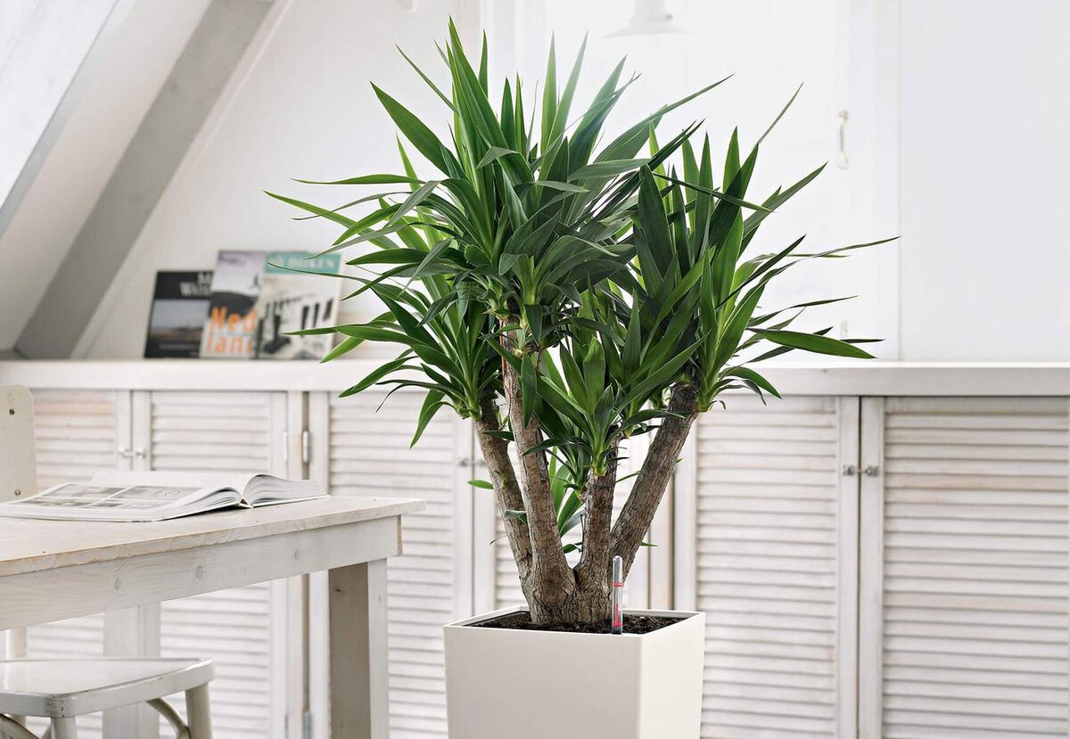 Юкка выделяется своими длинными заострёнными листьями и крепким стволом, придающими интерьеру оригинальный вид. Это растение быстро растёт, что позволяет ему достигать внушительных размеров всего за несколько лет, создавая эффект тропического уголка.