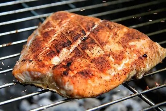 Промойте и обсушите рыбу, затем сбрызните лимонным соком, посолите и поперчите, оставив в холодном месте на полчаса. После этого смажьте куски лосося оливковым маслом и поставьте в холодильник еще на 10 минут перед жаркой на гриле — по 10 минут с каждой стороны. Перед подачей украсьте рыбу лимоном.