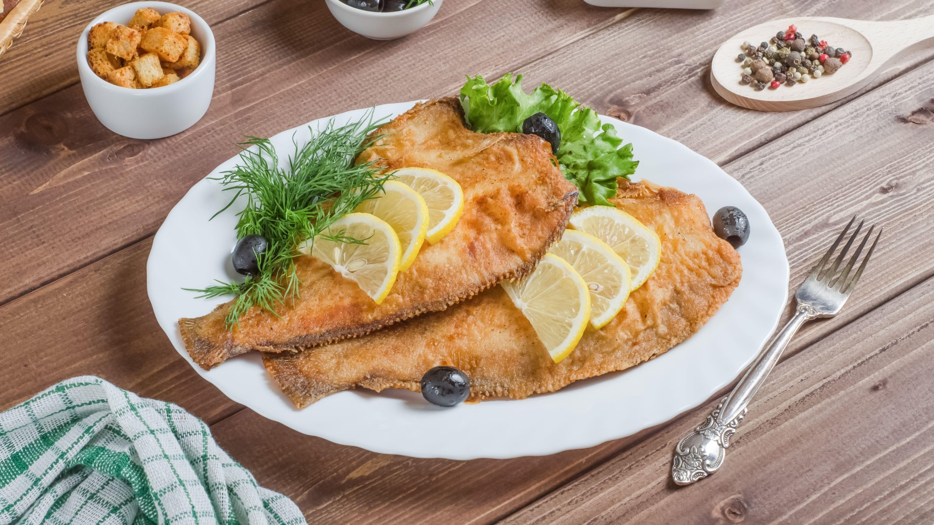 Перед приготовлением обильно полейте рыбу лимонным соком и дайте настояться в течение 10 минут. Затем посолите камбалу и обваляйте ее в муке. Дополнительно можно использовать любые специи, например, розмарин, базилик или тимьян.
