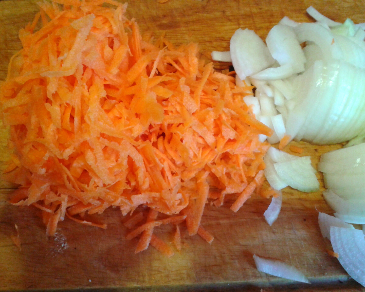 Сначала тщательно промывают рис, затем отваривают его до полуготовности, оставляя немного жестким. Лук нарезают крупно, а морковь натирают на терке. На сковороде разогревается растительное масло, где обжариваются лук и морковь до золотистой корочки. Обжаренные изделия необходимо охладить.