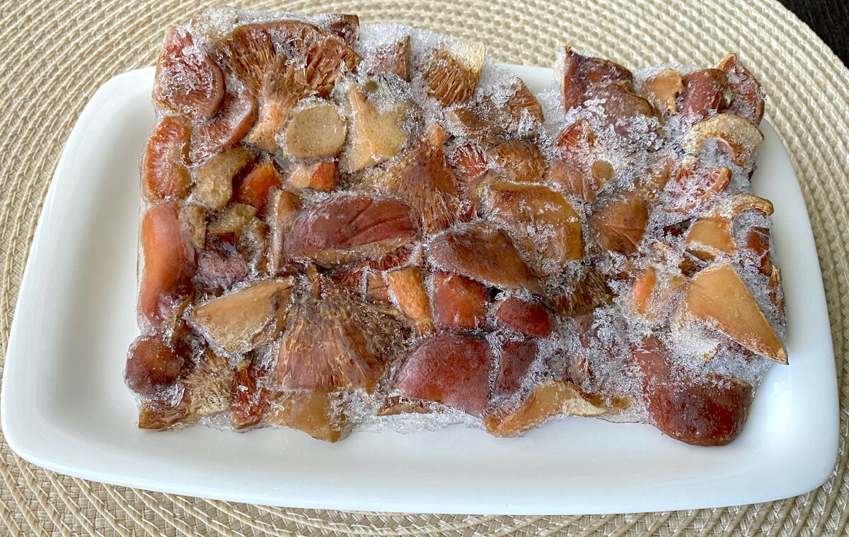Во-первых, прежде чем начинать готовить, нужно подготовить грибы. Замороженные рыжики необходимо разморозить, нарезать и слить лишнюю жидкость. Пусть они сохранят свою текстуру — в этом случае лучше оставить крупные кусочки, если это по вашему вкусу.