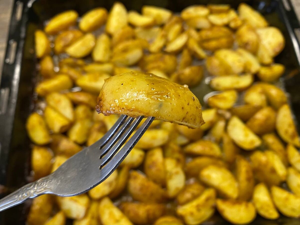 Подготовьте смесь из растительного масла, соли, перца и любимых приправ. Каждую картофелину стоит проколоть вилкой или ножом в нескольких местах, чтобы при запекании пар мог выходить, и клубни не трескались. Крупные картофелины лучше разрезать на 4-6 частей.