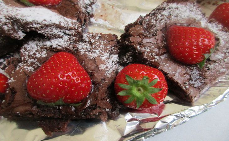 Переложить в нее тесто с шоколадом и клубникой, разровнять и отправить в духовку, предварительно разогретую до 185 градусов, готовить нежное печенье примерно четверть часа.