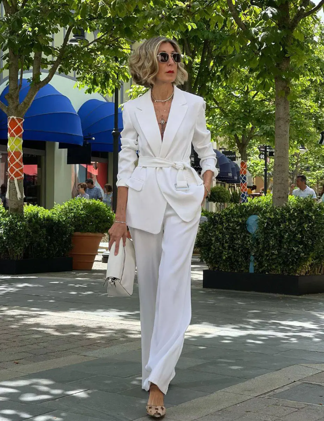 - Постельные тона: Белый цвет действительно способен освежить образ, добавляя легкости и молодости. Прекрасным выбором станет белый брючный костюм, который обеспечит элегантность и удобство.