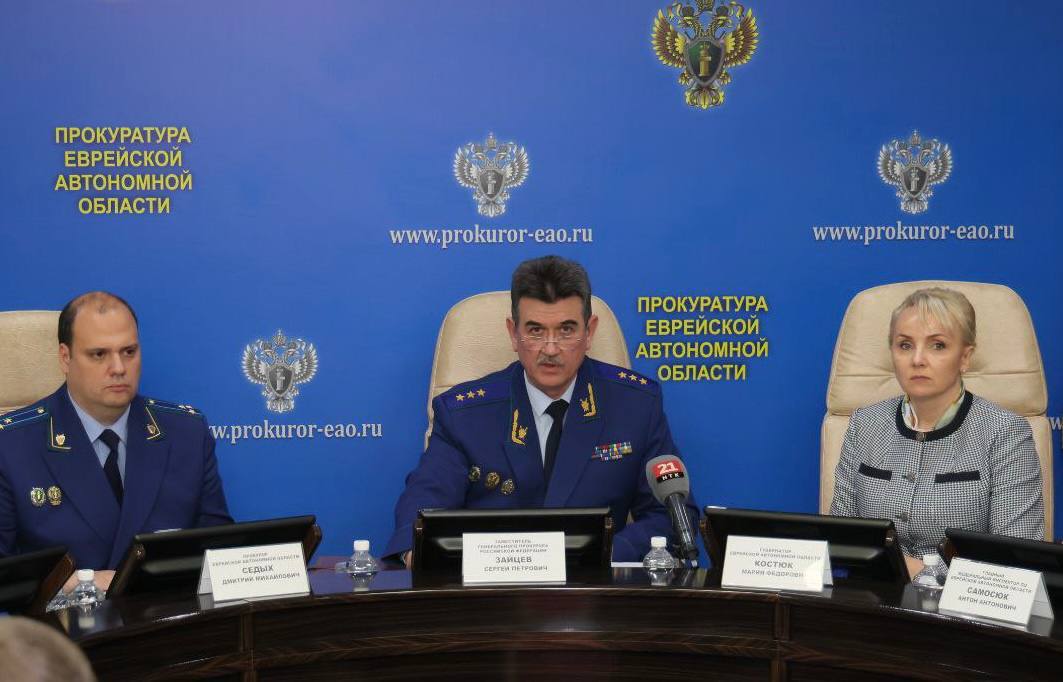 Сегодня, 13 ноября, заместитель Генерального прокурора Российской Федерации Сергей Зайцев представил коллективу областной прокуратуры, руководителям органов исполнительной, законодательной, судебной власти, правоохранительных ведомств назначенного Указом Президента Российской Федерации прокурора Еврейской автономной области старшего советника юстиции Дмитрия Седых.