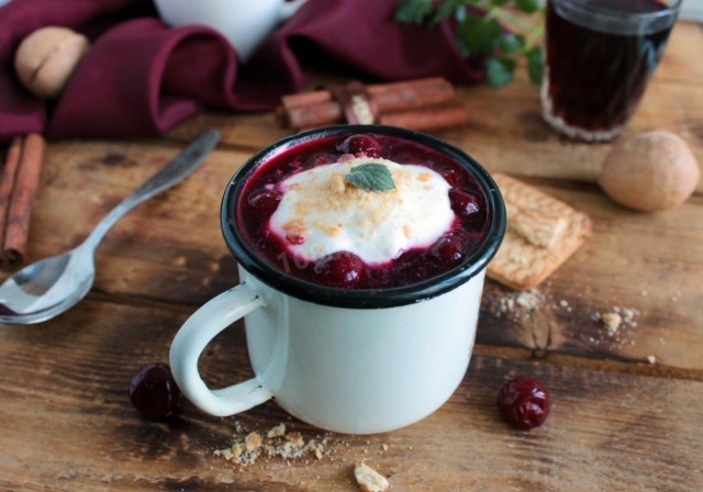 В оставшемся вине растворите крахмал, тщательно перемешайте до полного растворения. Влейте эту смесь в кастрюлю с вишней тонкой струйкой и продолжайте варить еще 2-3 минуты. После загустевания выключите огонь и дайте десерту немного остыть, затем разложите по креманкам. Для улучшения вкуса рекомендуется охладить десерт в холодильнике в течение получаса.
