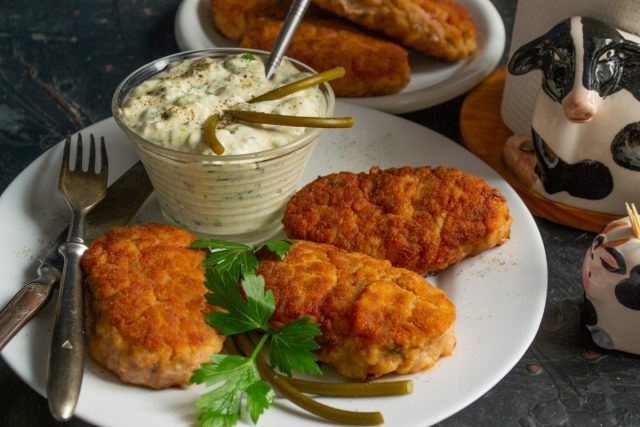 Готовые котлеты подают горячими, украсив блюдо зеленью и ставя на стол соус тартар. С этой простотой можно добиться настоящего кулинарного восторга, радуя близких и гостей удивительным сочетанием вкусов.