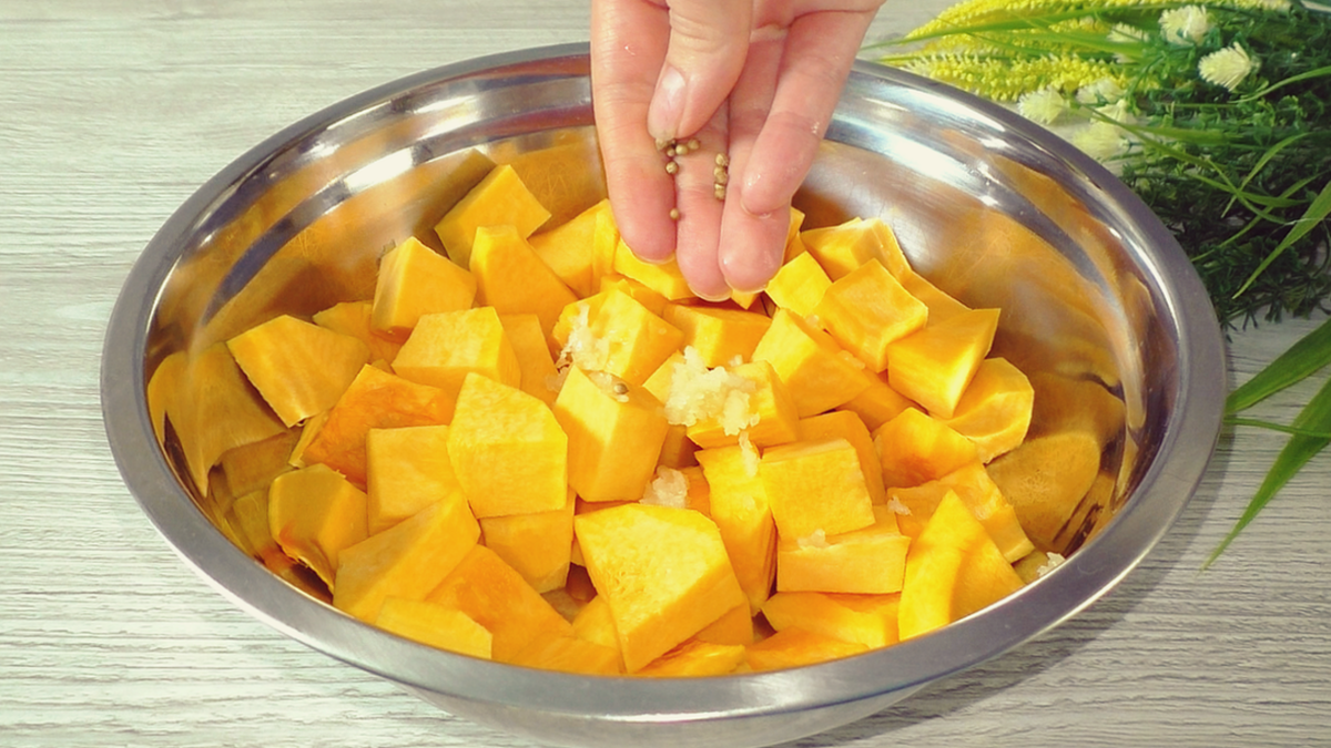 Для начала необходимо очистить тыкву и нарезать её на кусочки произвольной формы. Чеснок поможет придать блюду необходимый аромат, поэтому не стоит его упускать из виду — две-три дольки отлично подойдут. Специи можно выбрать по своему вкусу, например, кориандр и хмели-сунели, которые прекрасно дополнят оранжевое лакомство.