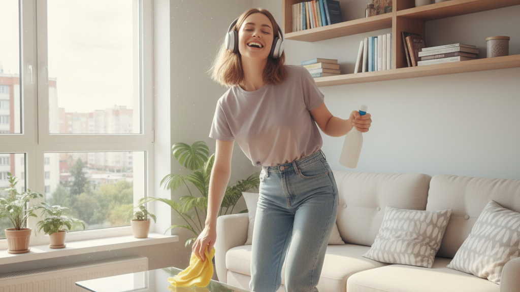 - Музыка – ваш переводчик в мир чистоты. Создайте плейлист с любимыми треками или подкастами. Забудьте о скучной уборке и превратите свой дом в танцпол!