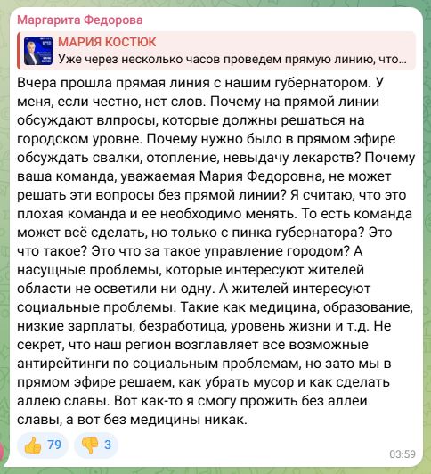 «Этот «свободный форум» заводили на период выборов, когда важно было продемонстрировать близость Марии Федоровны к народу. Ключевая цель изначально состояла не в том, чтобы быть близкой к народу, но казаться таковой. Со временем чат превратился в квазидиспетчерскую службу, где чиновники из разных отделов, департаментов и местных администраций в режиме 24/7 отвечали на вопросы граждан. Всё это, разумеется, чрезмерно утомляло местную бюрократию, но деваться им было некуда», — отмечает наш эксперт.