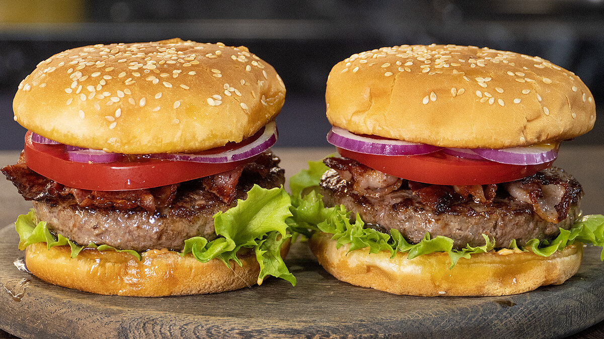 Из подготовленного фарша нужно сформировать котлеты и обжарить их на раскаленной сковороде. Для создания особого аромата и эффекта легкой дымки, котлеты можно обжечь газовой горелкой. После обжаривания, булки заполняются: сначала наносятся соусы, затем укладывается лист салата, огурцы, котлета, бекон, нарезанный помидор и лук. Закрыть бургер второй половинкой булки, и он готов к подаче!
