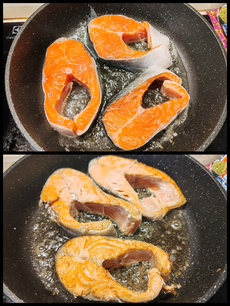 Первым делом следует разогреть сковороду. На ней готовится форель: стейки обжариваются с обеих сторон до появления золотистой корочки. Добавление оливкового масла придаст блюду нежный аромат, но можно обойтись и без него.