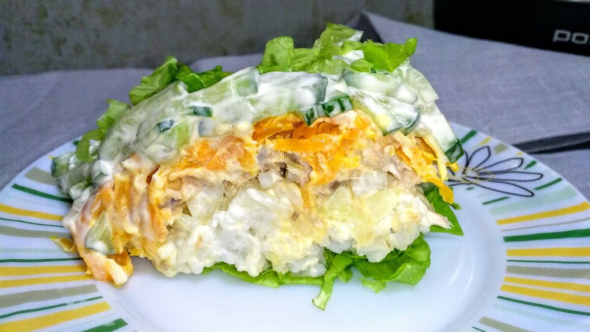 На рис выкладывается маринованный лук, затем консервированная горбуша, все это вновь смазывается майонезом. Следующий этап — морковный слой с майонезом. Под завеса завершающего штриха украсить слой свежих огурцов, немного посолить и добавить майонез. Завершить оформление можно мелко нарезанными салатными листьями или укропом.