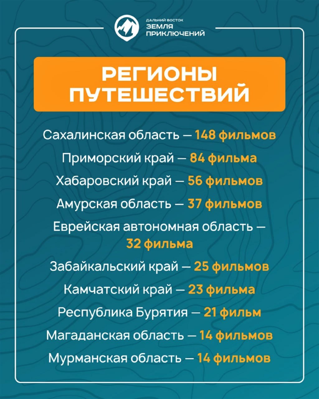 Больше всего фильмов снято о путешествиях по Сахалинской области – 148, Приморскому краю – 84, и Хабаровскому краю – 56 видеороликов. О путешествиях по Амурской области на конкурс прислали 37 видеоработ, по Еврейской автономной области – 32 видеоролика, по Забайкальскому и Камчатскому краям поступило 25 и 23 фильма соответственно, по Республике Бурятия – 21 видеоработа. По 14 фильмов снято о Магаданской и Мурманской областях, 11 видеоработ – о Республике Саха (Якутия), 7 видеороликов – об Архангельской области. В 6 фильмах речь идет о туристических маршрутах по Ненецкому автономному округу, Республике Коми, в 5 – о путешествиях по Республике Карелия, Ямало-Ненецкому и Чукотскому автономным округам, 3 фильма сняты о Ханты-Мансийском автономном округе.