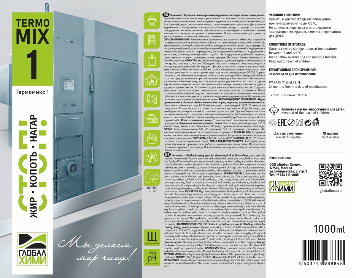 Термомикс 1 безопасен для людей, животных и экологии. Его щелочная формула с pH 13 (в растворе) сочетает в себе легкость применения и мощь концентрации: 1 литр средства может обеспечить от 33 до 100 литров рабочего раствора, что делает его выгодным решением для любых потребностей.
