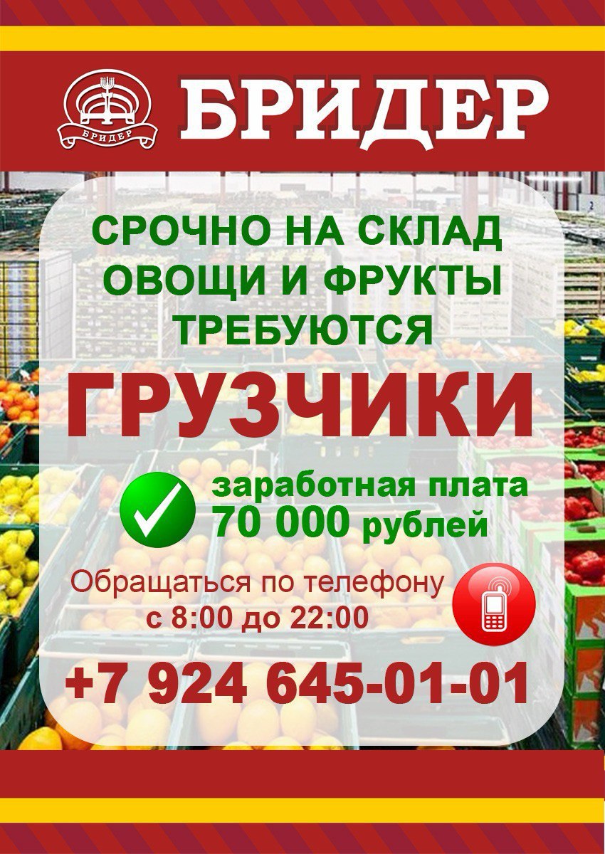 На склад овощи и фрукты ООО "Бридер" требуются грузчики.