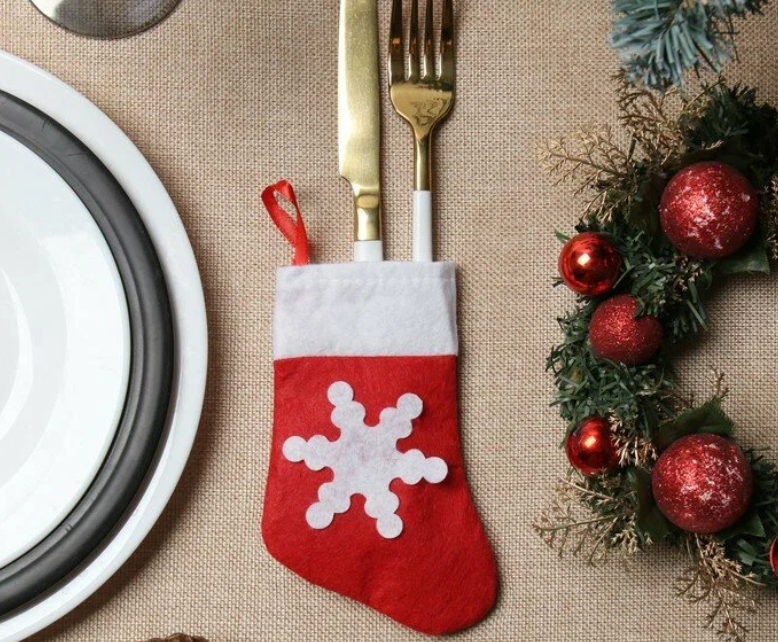 - Конверт для приборов «Рождественский носок»: Это мягкое и милое украшение не только аккуратно держит все столовые принадлежности, но и моментально создает атмосферу праздника. Яркие оттенки делают его идеальным для любого интерьера. Посмотреть.