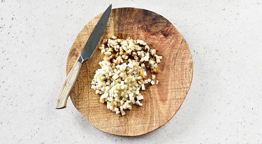 Нарезать очищенные грибы мелкими кубиками размером около 0,5 см. Хотя блендер — удобный инструмент, ручная нарезка сохраняет текстуру, что делает соус более интересным.