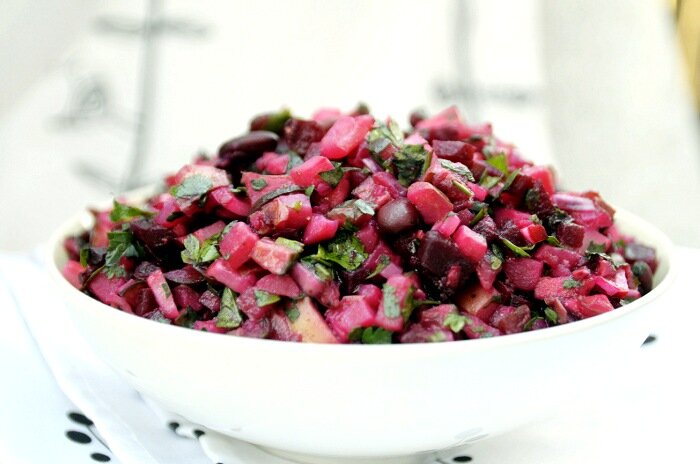 Свекла — главный ингредиент данного салата. Ее лучше запекать, а не варить: таким образом, она сохраняет больше аромата и хрусткости. После запекания свеклу охлаждают, очищают и нарезают аккуратными кубиками. Картофель также отварить, охладить и нарезать. Ниже представленный список подскажет необходимые компоненты: