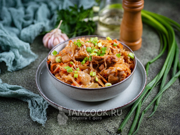- Ингредиенты: капуста квашеная (800 г), свиные ребрышки (600 г), 1 луковица, томатный соус (4 ст.л.), 2 зубчика чеснока, соль, паприка и растительное масло.