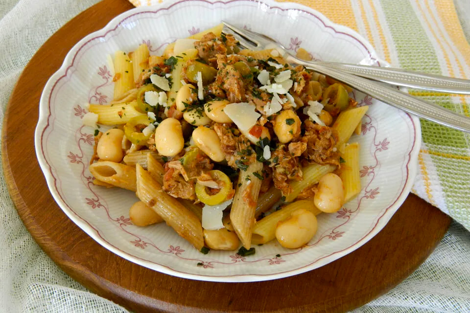 На сковороде разогреваем немного масла и обжариваем вяленые томаты. Когда они примут легкий золотистый цвет, добавляем оливки и нагреваем еще несколько минут. Затем к ним присоединяются фасоль и размятый тунец. Не забываем про соль и перец по вкусу!