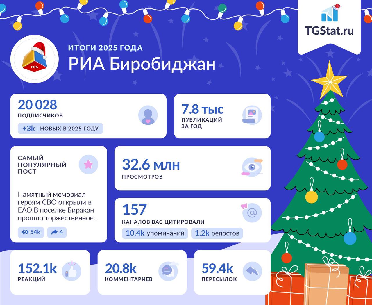В последний день 2025 года принято подводить итоги, и мы не стали исключением. Мы искренне благодарим наших читателей, ведь наш телеграм-канал достиг отметки в 20 000 подписчиков. В этом году мы получили 32,6 млн просмотров, 152,1 тыс. реакций на посты и более 20 000 комментариев. Телеграм-канал РИА Биробиджан заслуженно стал одним из самых популярных в ЕАО. Нам доверяют!