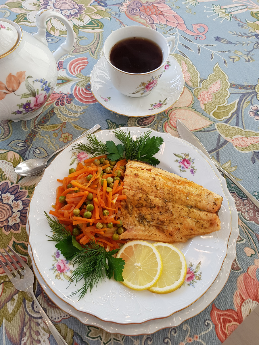 Пока рыба маринуется, можно заняться овощами. Морковь и лук нарезаются соломкой. В сковороде разогревается столовая ложка масла, куда помещают сначала лук, а затем морковь. Овощи пассеруются до мягкости, после чего добавляют соль, приправы и розмарин. Все это тушится под крышкой в течение 10 минут, чтобы избежать пересушивания.