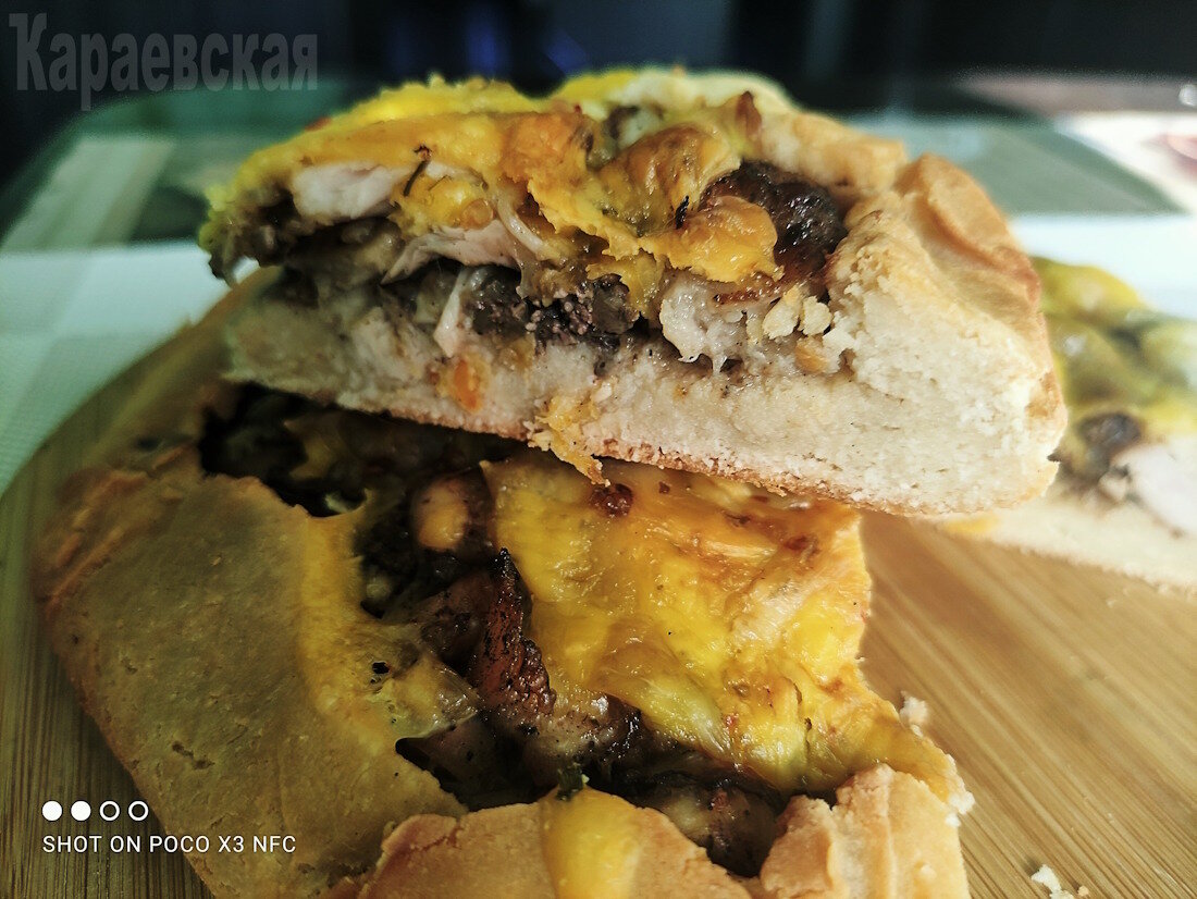 Формируют из теста шар и раскатывают его между двумя листами пергамента, обеспечивая больший диаметр, чем форма для выпекания (в идеале не меньше 16 см). Осторожно переносят тесто в форму, выкладывают начинку и аккуратно загибают края. В завершение посыпают поверх пирога тертым сыром.