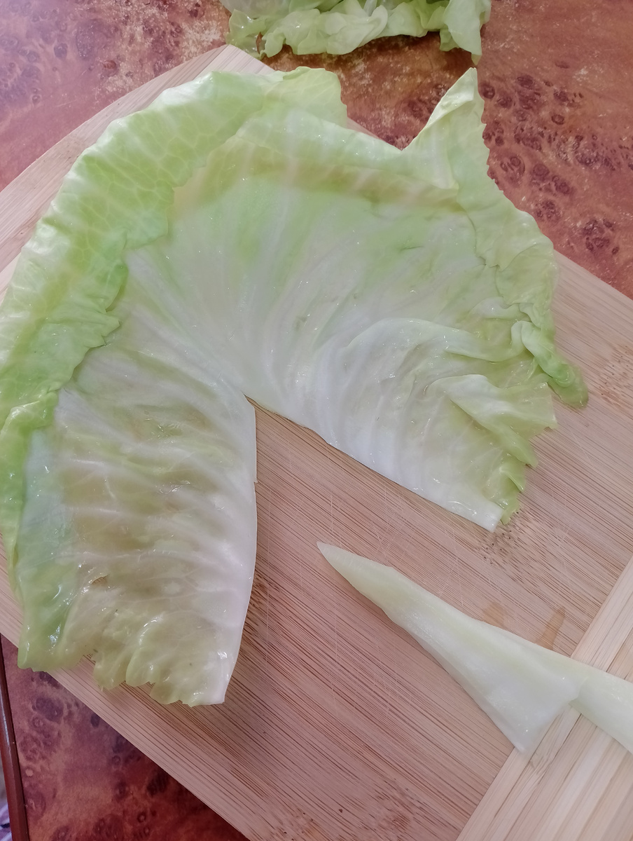 Первым шагом в приготовлении голубцов является работа с капустой. Листья аккуратно отделяются от кочана. Есть несколько способов, как это сделать: можно опустить кочан в кипящую воду, чтобы листья стали мягкими, или немного подогреть в духовке. Необходимого количества — всего шесть листьев. Удобнее каждую листик опустить в кипяток и аккуратно срезать жесткую прожилку.