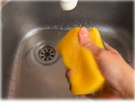 - Подготовка: Сначала необходимо тщательно промыть губку под горячей водой и убедиться, что она свободна от видимых загрязнений.