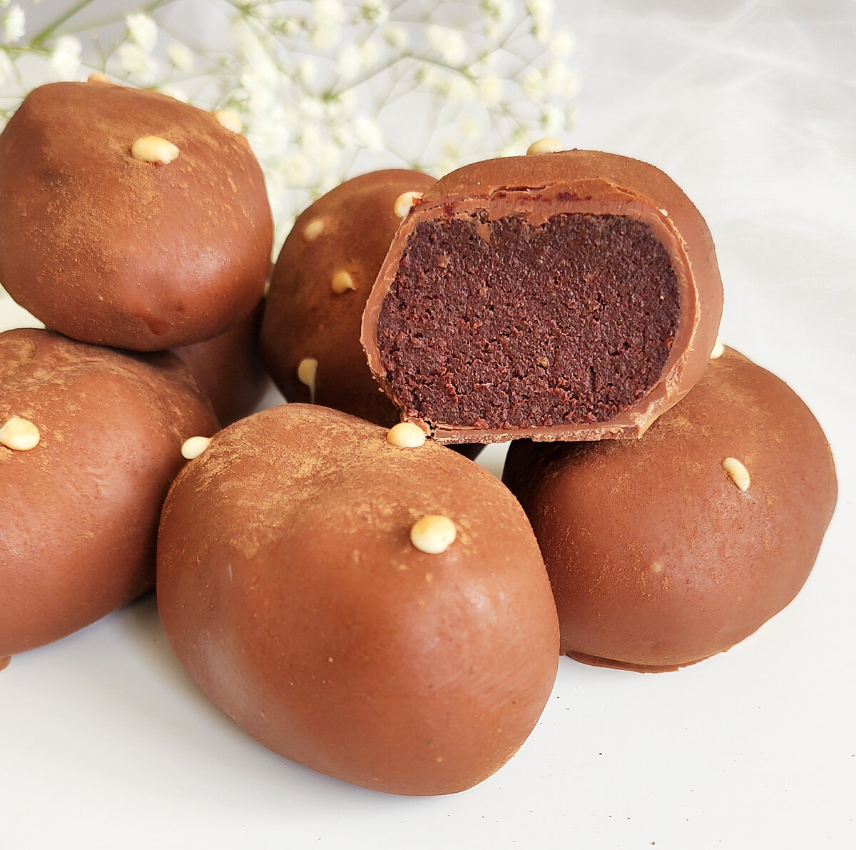 Сначала следует смешать все сухие компоненты. Затем разбить яйца и слегка их взбить, добавить кефир и растопленное масло. Все ингредиенты тщательно перемешать с помощью миксера и выпекать при температуре 180°C в течение 40-45 минут. После охлаждения бисквит нужно измельчить и смешать с творожным сыром. Из полученной массы сформировать пирожные и заморозить их на 4 часа.
