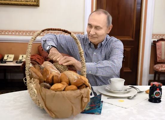 На фото: президент России Владимир Путин с выпечкой из подмосковной пекарни «Машенька», источник: пресс-служба Кремля