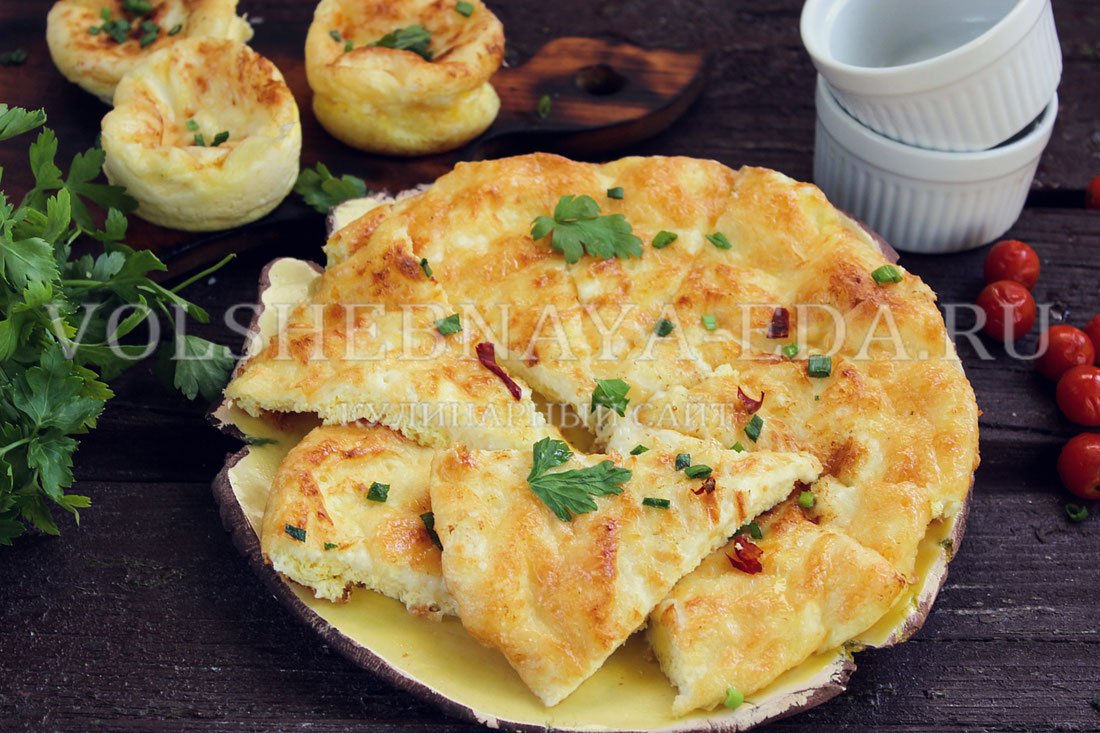 Борано следует подавать горячим, посыпав сверху рубленой зеленью. Режется на треугольные или квадратные порции, и маленькие формочки легко вынимаются. Верхушку украшает золотистая корочка, а внутри омлет остается сочным и ароматным. Приятного аппетита!
