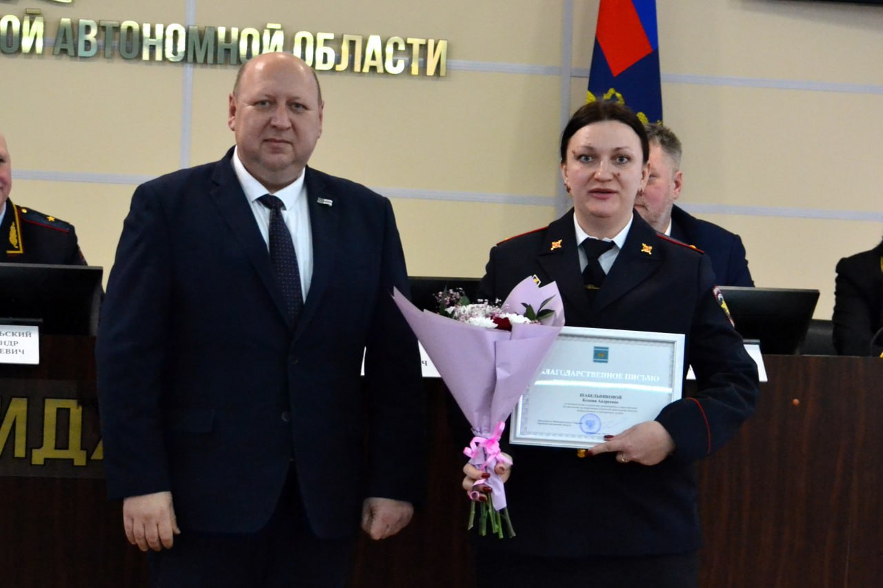 «Жители области на вас рассчитывают, и мы уверены, что совершенные преступления не останутся безнаказанными. Спасибо вам за вашу нелегкую, очень непростую работу», - сказал председатель и вручил Благодарственные письма ЗС сотрудникам подразделений УМВД по ЕАО Виктории Ростовцевой, Анастасии Тимофеевой и Ксении Шабельниковой.