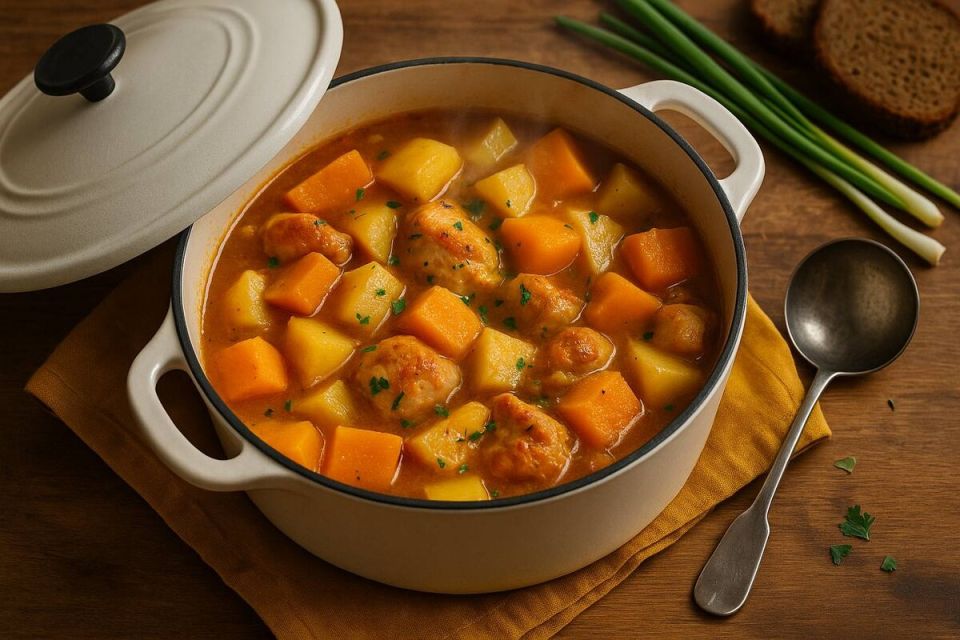Рагу, которое нежно готовится на плите, позволит одновременно проверить школьные дневники, подготовить вещи на завтра и организовать документы. Это блюдо отличается насыщенным вкусом, в котором сладость тыквы переплетается с сочной курицей и нежным картофелем.