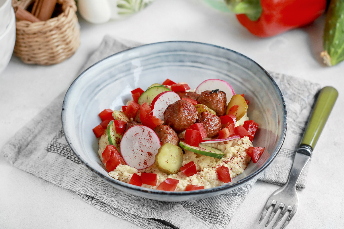 Шаг 4: На тарелке для подачи распределить хумус, сверху выложить фрикадельки, нарезанные овощи, а затем полить оставшимся оливковым маслом и посыпать паприкой. Подавайте блюдо сразу же.