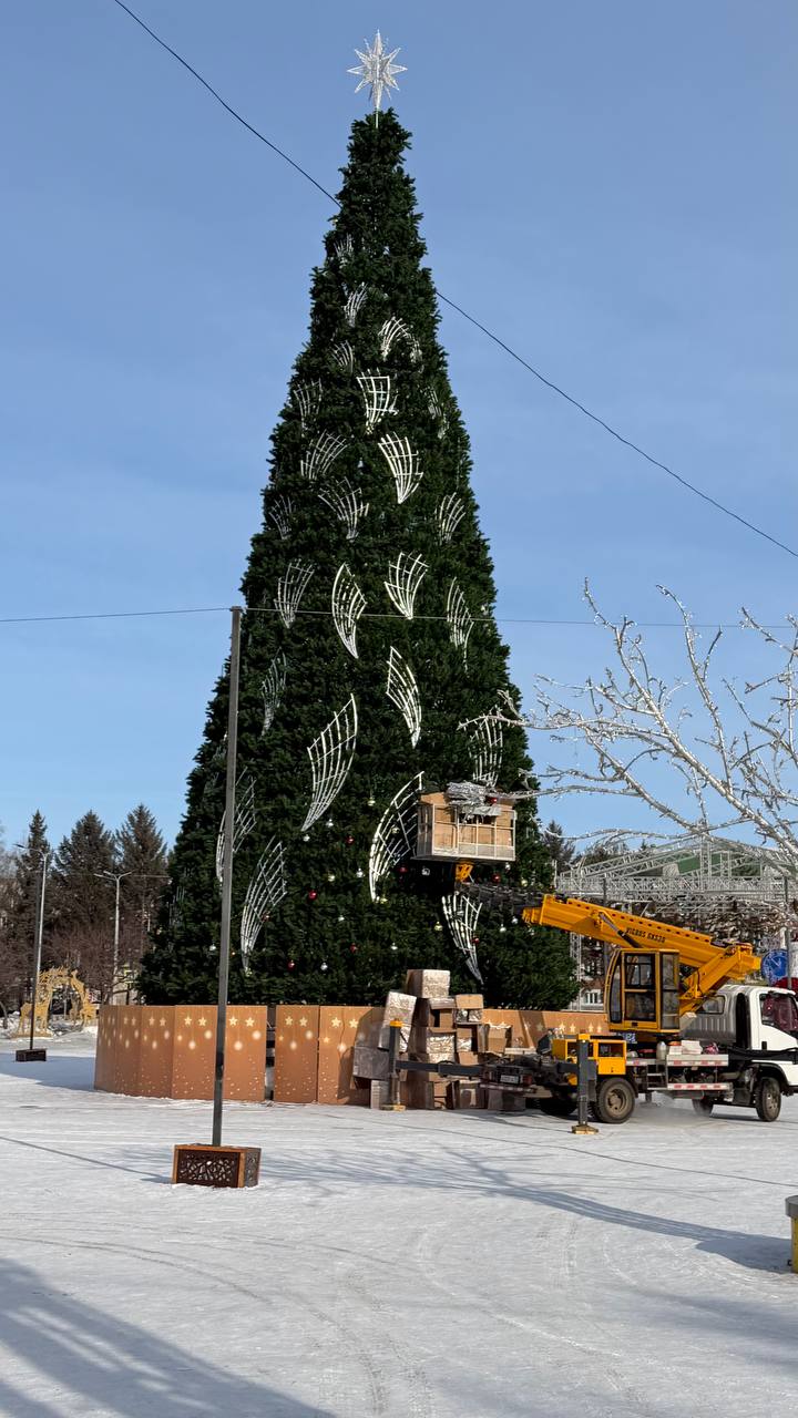 Накануне специалисты убрали купол из гирлянд, располагавшийся над центральной елкой Биробиджана. Сегодня же начались работы по демонтажу конструкции самой ели.