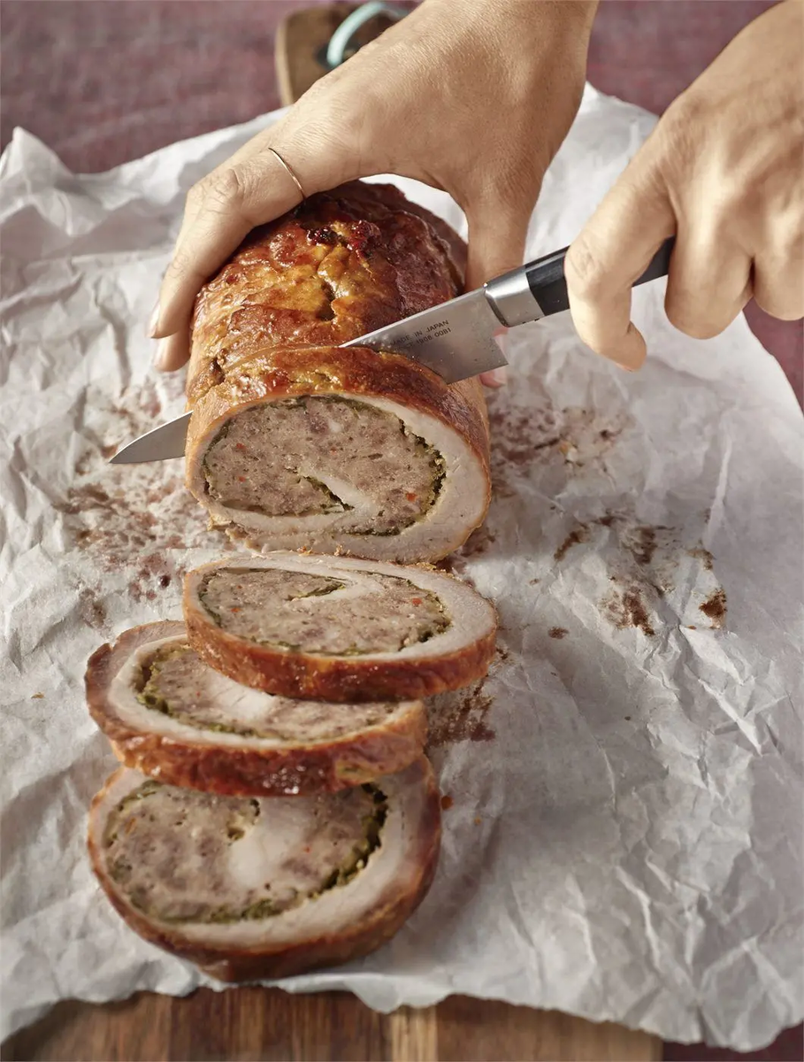 Аккуратно сверните свинину в рулет, перевяжите его бечевкой, смажьте оставшимся майонезом и посыпьте любимыми приправами и солью. Заверните рулет в алюминиевую фольгу и поместите в противень или жаропрочную форму.