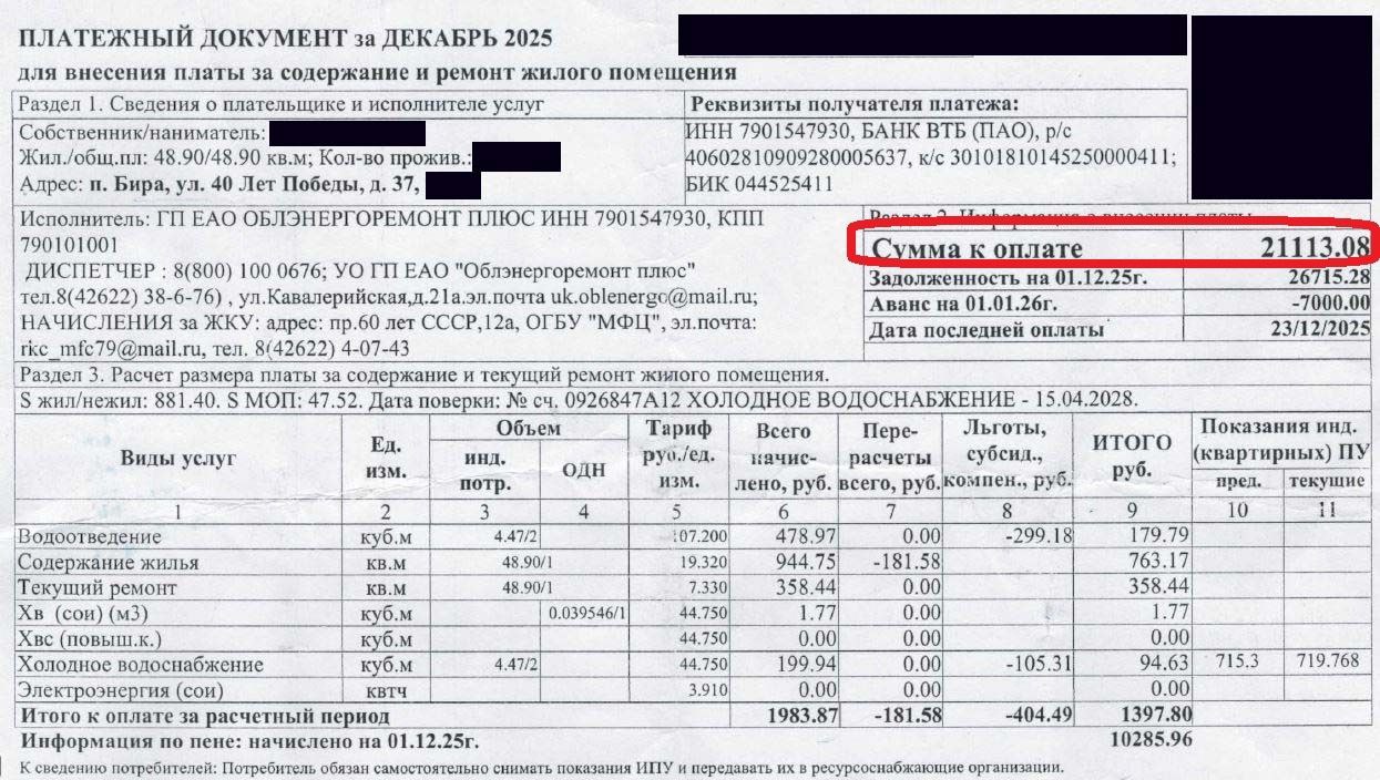 В подтверждение своих слов граждане предъявили платежные документы. К примеру, в пос. Бира за обогрев двухкомнатной квартиры площадью 49 квадратных метров местной жительнице начислили в декабре 11 887 рублей. Аналогичные жалобы поступили из пос. Смидович и даже г. Биробиджана.