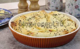 Как только все трубочки собраны, пирог заливается яично-молочной смесью и покрывается оставшимся сливочным маслом, а сверху посыпается кунжутом для красоты и аромата. Затем пирог выпекается в разогретой до 180°С духовке в течение 30-40 минут, пока не приобретет золотистую корочку.