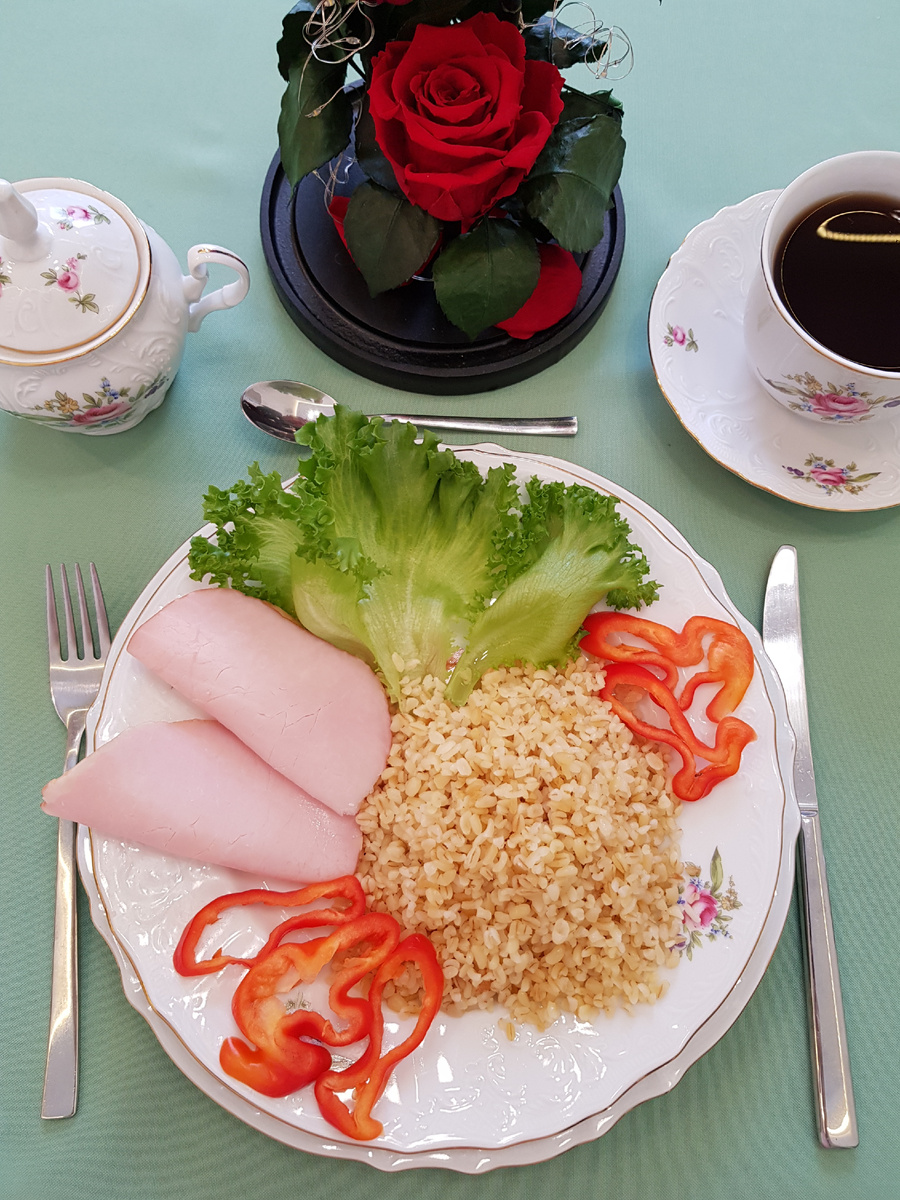 Осторожный расчёт: на 3 порции — 200 г булгура и 400 г воды; если вы хотите одну порцию, берите примерно 67 г булгура и 133 г воды.
