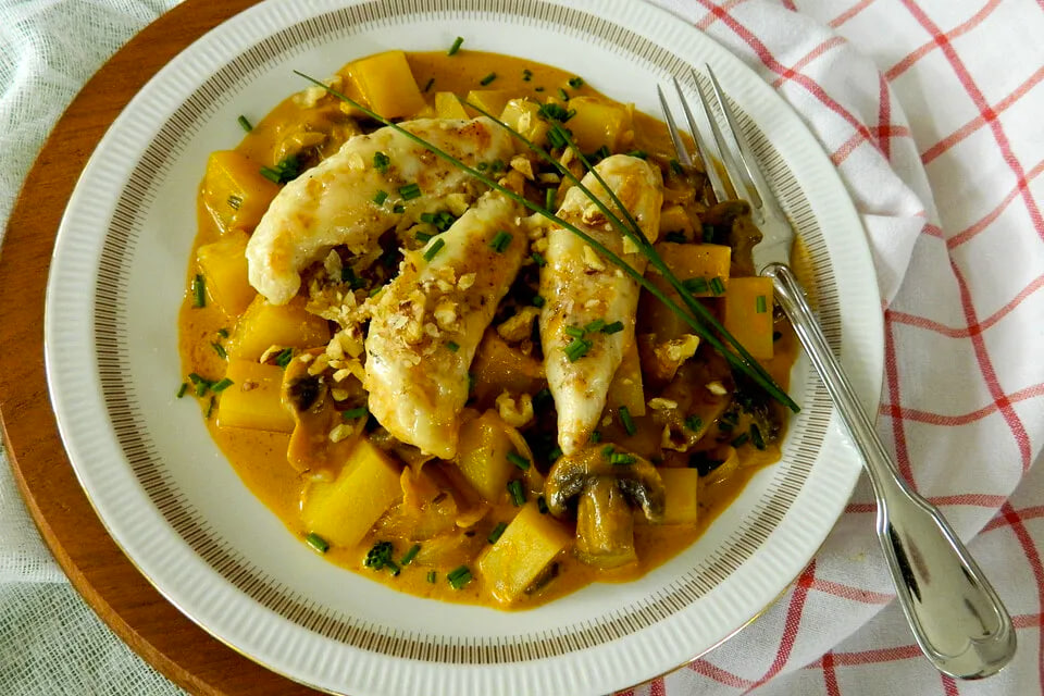 Начинаем с подготовки ингредиентов: куриное филе нарезаем на порционные куски, картофель очищаем и режем кубиками, грибочки – ломтиками. Лук нарезаем тонким полукольцами, чеснок рубим или давим, сыр натираем, а орехи – при необходимости также рубим.