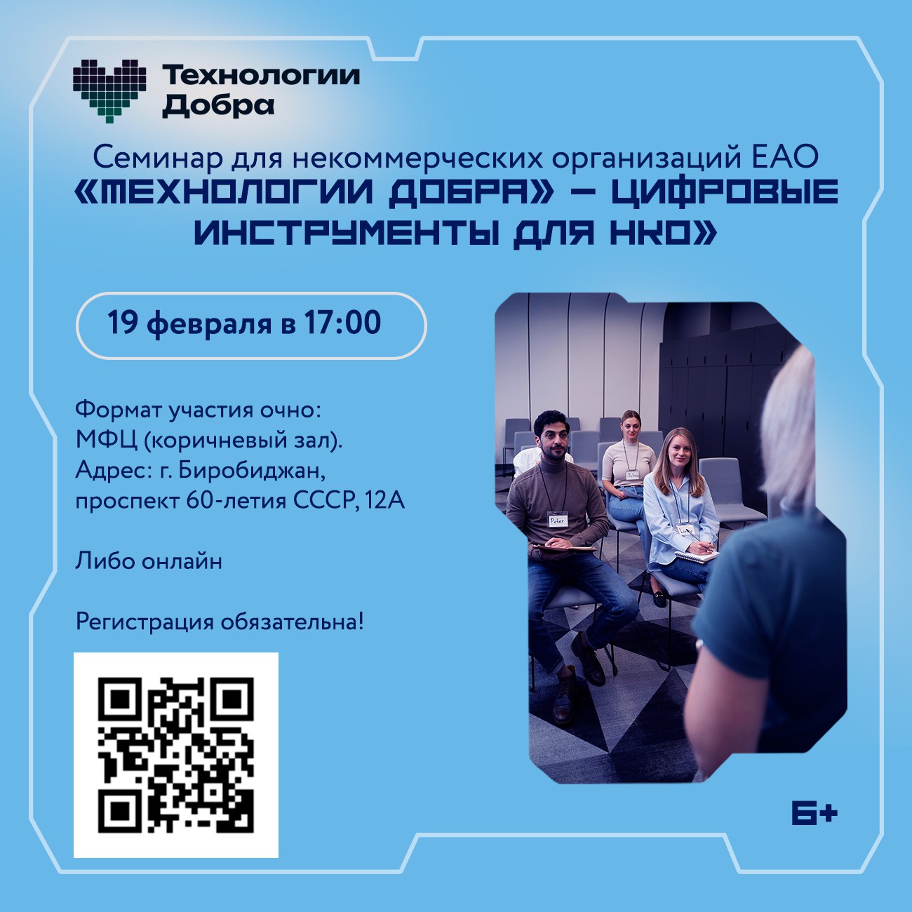 19 февраля команда федерального проекта «Технологии Добра» совместно с Фондом «Гражданские инициативы ЕАО» проведет семинар для некоммерческих организаций региона (6+).