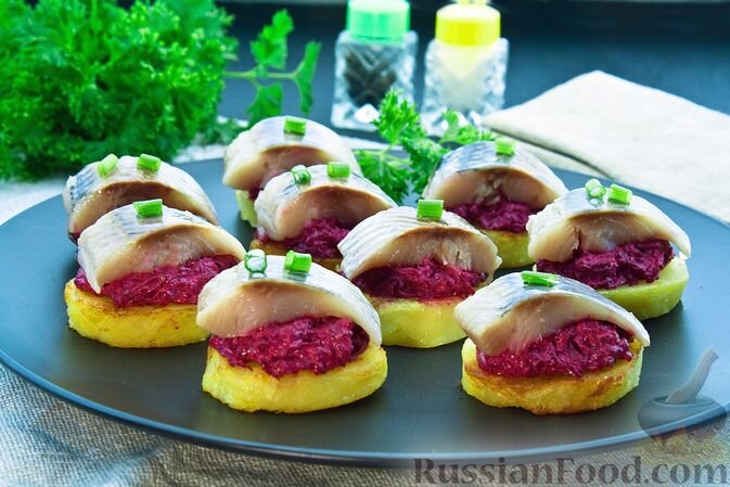 Эта закуска идеально подходит для любителей оригинальных сочетаний. Нарезанный картофель, свекольная начинка с добавлением чеснока и кусочек слабосолёной сельди – вы даже не заметите, как создадите шедевр на своей кухне!